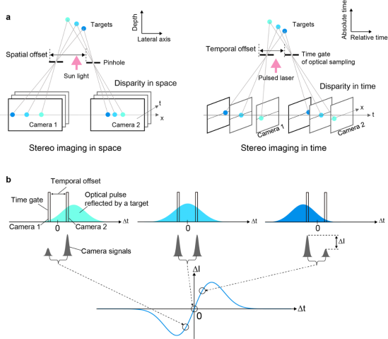 为应对这一挑战,研究团队提出时域立体成像(TDS)技术,通过两台时域偏移的摄像头精确捕捉激光脉冲的时间差异,TDS避免了空间视差的限制,实现了更高的空间分辨率。结合飞秒电光梳合成和非线性光学采样,TDS在长距离、大动态范围下实现了亚100纳米的深度精度,并具备毫秒级动态测量能力,提升了成像精度和速度。这一技术为高精度、实时三维成像提供了理想解决方案,并推动了精密测量和工业检测领域的发展。