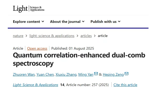 研究成果以“Quantum correlation-enhanced dual-comb spectroscopy”为题,于2025年8月1日发表于Light: Science & Applications。