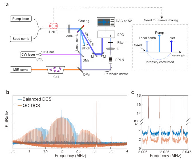 近日,华东师范大学重庆研究院曾和平教授与闫明研究员团队在双光梳光谱领域取得进展。研究团队提出了一种量子关联增强双光梳光谱(QC-DCS)技术。该技术利用关联光梳的强度差压缩,突破了散粒噪声瓶颈,与频率上转换探测技术结合,实现中红外量子增强的分子指纹谱测量,在精密光谱、痕量分析、红外遥感、燃烧诊断等前沿领域有广阔的应用前景。