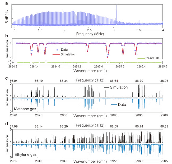 该技术利用电光梳的可调谐特性,成功实现了宽带中红外光谱测量:光谱范围2870-2965 cm-1(86.04 - 88.89THz),谱宽接近100 cm-1或3 THz,覆盖了甲烷、乙炔等碳氢化合物的基带振动指纹谱线(图4)。此外,该技术采用电光合成与双光梳拍频探测技术,可以实现对超200根频率谱线的一次性同时测量,测量光谱的分辨率可达7.5 pm,梳齿中心频率的不确定度可溯源至超窄线宽连续激光器与氢钟。